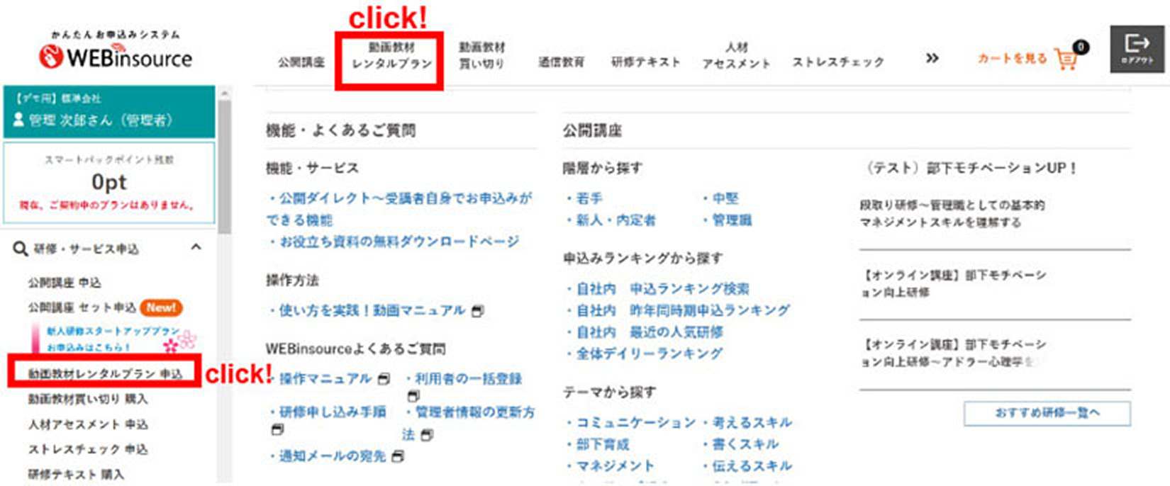 2.管理者メニュー「動画教材レンタルプラン申込履歴」をクリック