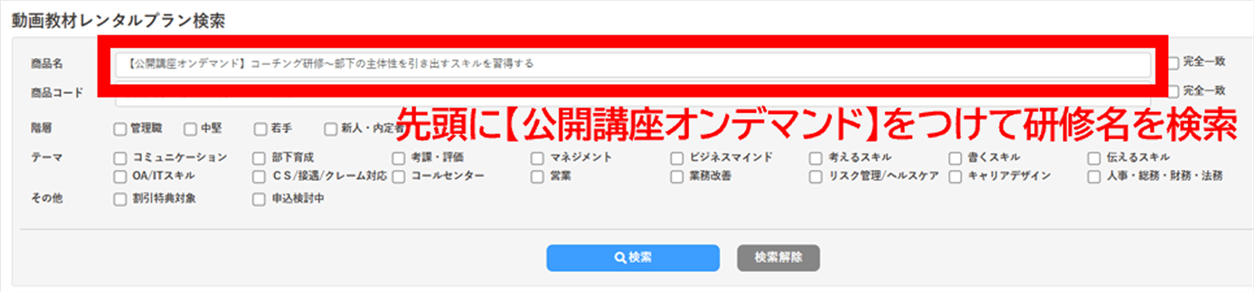 WEBinsourceにログインし、画面上部の「動画教材レンタルプラン」もしくは左側のメニューバーにある「動画教材レンタルプラン申込」をクリックして検索画面を開く。