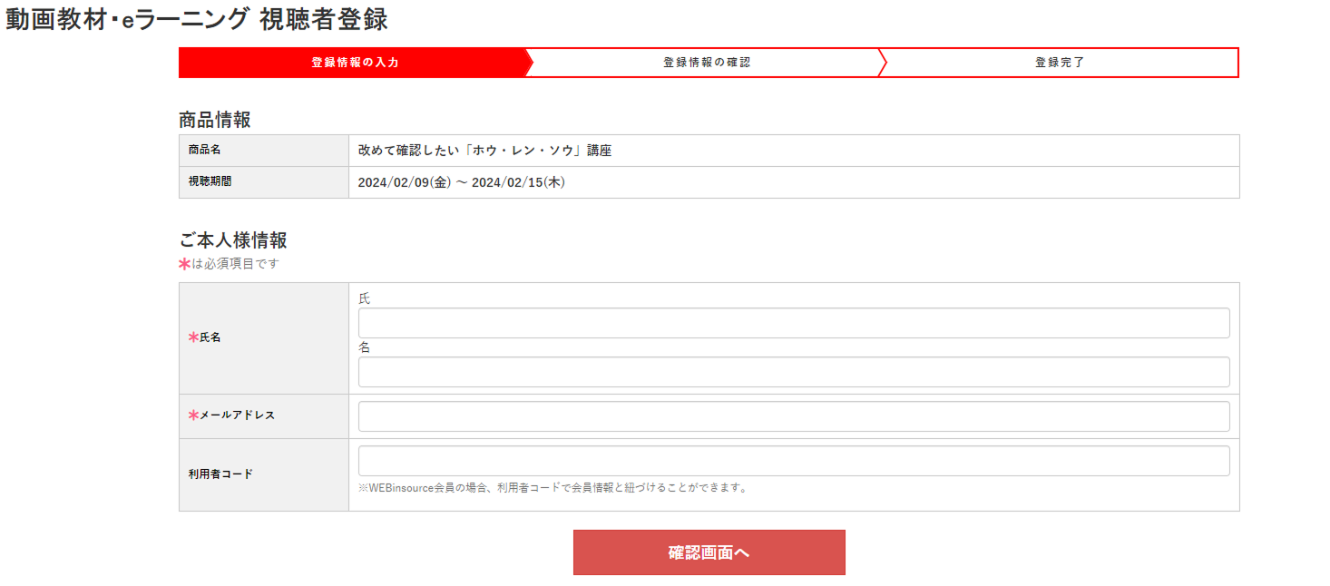 視聴登録サイトのURLにアクセスすると、動画教材・eラーニングの視聴者登録の画面になります。