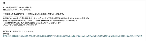 (1)アカウント登録完了後、登録時に使用した受講者さまのアドレスに動画視聴先のURLとパスワードがメールで送られます。