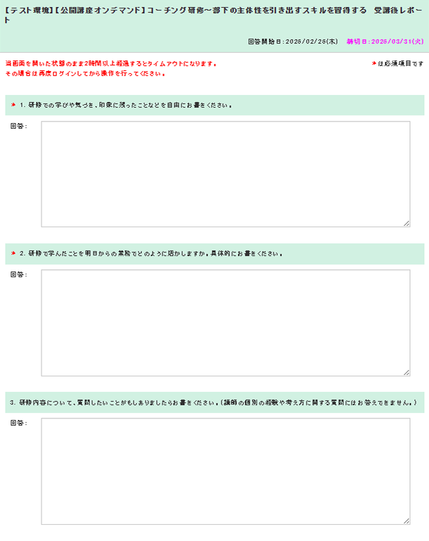 動画をすべて視聴し、視聴完了報告を行うと、受講レポートに回答できるようになります。こちらに回答した時点で、受講完了となります。なお、視聴期間を過ぎるとレポートに回答できなくなりますので、ご注意ください。