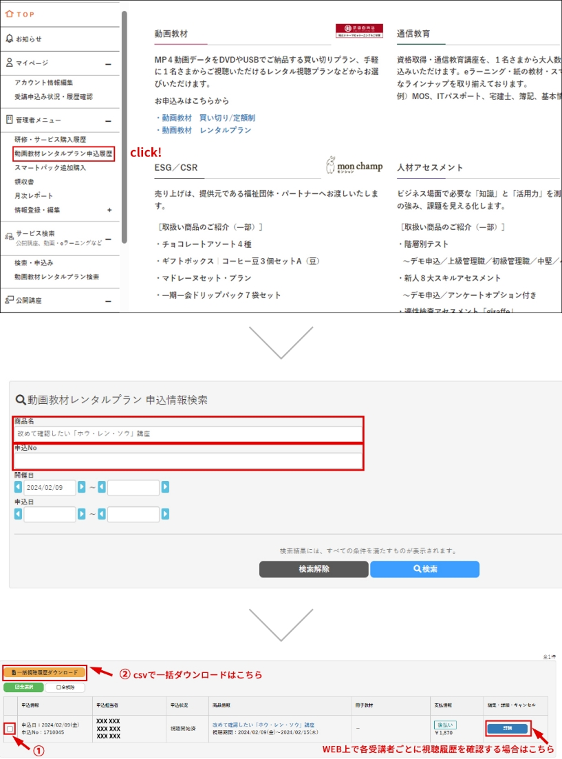 ②視聴結果を確認したいお申込みを検索する