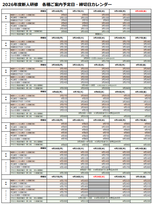 「2026年3月16日(月)~5月1日(金)」の期間については、実施形式により、お申込み時の注意点や、研修の事前準備物等に違いがあるため、お申込み前に必ずご確認をお願いいたします。(2026年2月18日更新)