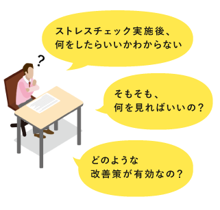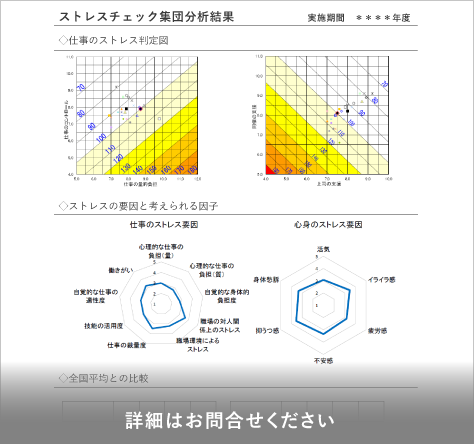ストレスチェックの実施はもちろん、受検率を上げるための回答催促、所属以外にも性別や勤務形態ほか様々な観点から見る集団分析、そして研修会社ならではの集団分析結果を用いた結果説明会の開催、セルフケア研修や職場環境改善研修など、「ストレスチェック」を「職場のストレス環境改善」につなげるための一貫したサービスが特徴です。ストレスチェック実施後、「分析結果の見方がわからない」、「改善の仕方がわからない」などのお悩みを解決し、具体的なアクションをおこすためのサポートをいたします。