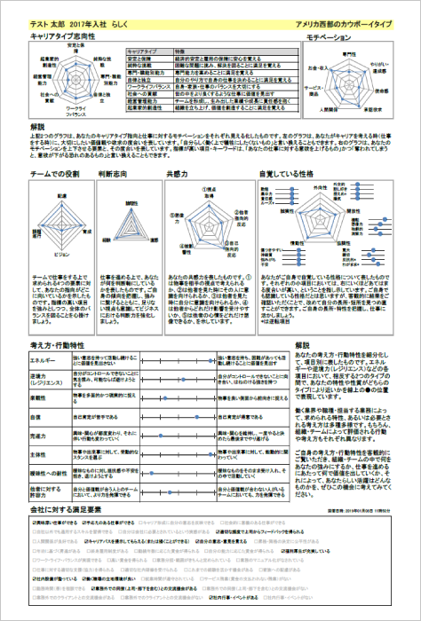 社員のキャリア志向、モチベーション要素、活躍しやすい環境、考え方・行動特性などを"見える化" するアセスメントツールです。