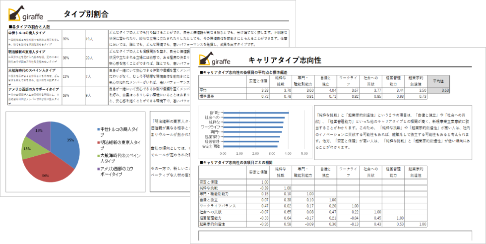 各カテゴリー(キャリアタイプ志向性・モチベーションの源・主体性や完遂力などの考え方や行動特性 等)に分析結果を表示し ます。それぞれの項目における組織の平均値・偏差・相関関係を記載しておりますので、組織全体の特徴を掴むことができます。