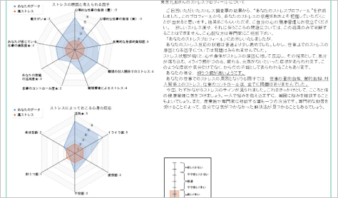 調査票に入力した内容に基づき、「職場における当該労働者の心理的な負担の原因に関する項目」、「心理的な負担による心身の自覚症状に関する項目」及び「職場における他の労働者による当該労働者への支援に関する項目」について、レーダーチャートや評価コメントを用いた個人結果を表示します。