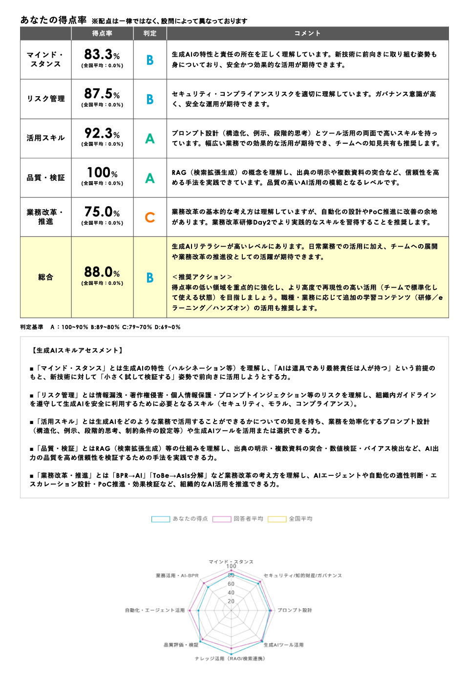 情報漏洩、著作権、個人情報、プロンプトインジェクションなど、リスク理解のばらつきを見える化。ガイドライン周知施策の効果測定にも活用できます。