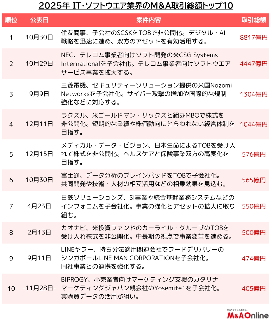 2025年のIT・ソフトウエア業界では、AI(人工知能)とIT人材不足に関連するM&Aが目を引いた。