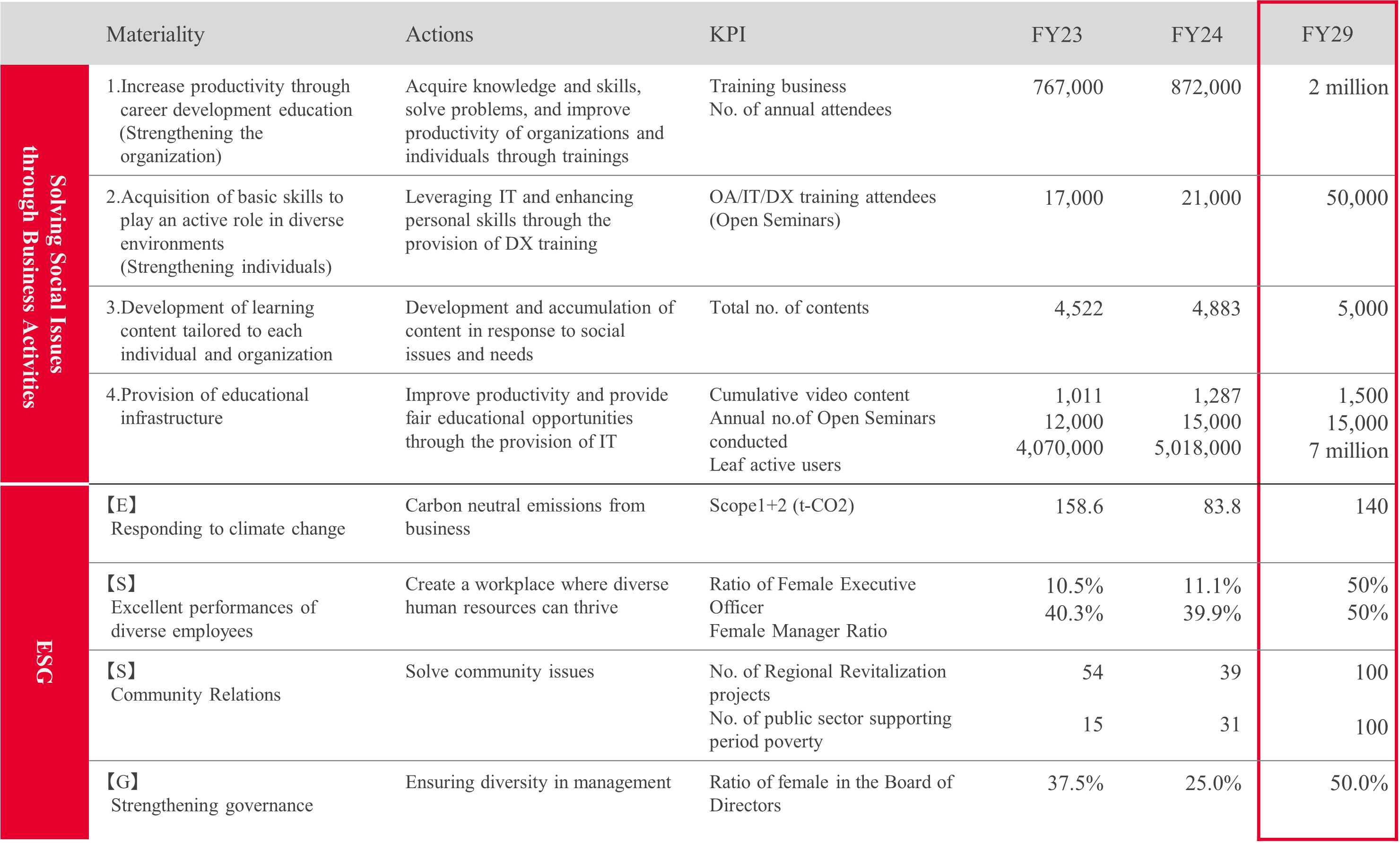 Through our current business of education and IT services, we help solve organizational issues and improve productivity. As a company that solves social issues, we will proactively create sustainable mechanisms and solutions by strengthening relationships with stakeholders while leveraging the Group's resources and strengths. At the same time, we aim to reduce the burden on the environment, improve human capital, and strengthen corporate governance. Under the ESG+P management policy, we are committed to achieving sustainable "performance" improvement while expanding businesses and initiatives that provide social value. We hope to lead to the development of a joyful society where diverse people can maximize their individuality and abilities and play an active role while respecting each other.