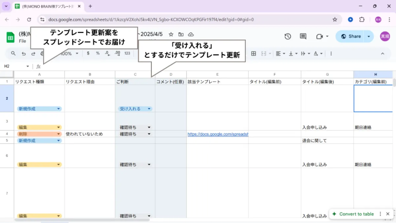 スプレッドシートに記載された提案内容を「受け入れる」とするだけで、テンプレートの更新が自動で適用されます。