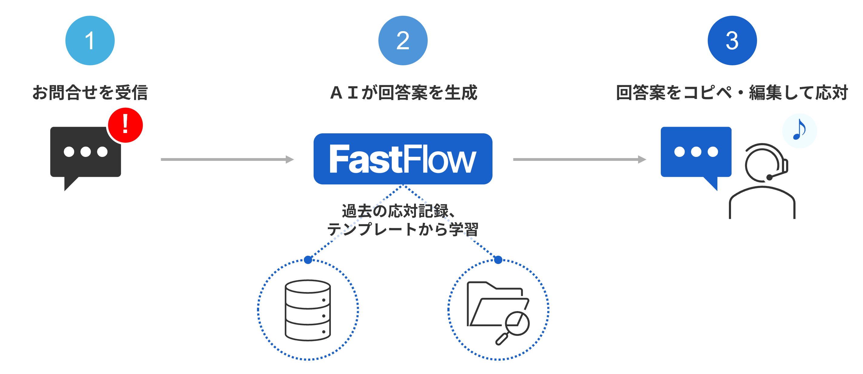 FastFlowは、カスタマーサポート宛に来る顧客からの問合せに対し、回答案を自動生成するAIツールです。