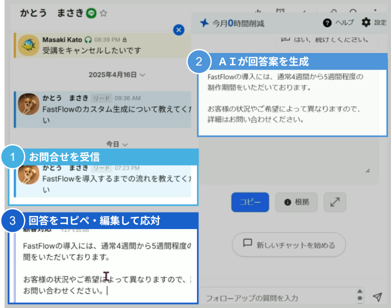 オペレーターは回答案をコピー&ペーストするだけで、顧客からの問合せ対応が完結できます。また、編集し回答された内容もFastFlowに蓄積されるため、生成される回答の精度が徐々に高まっていきます。