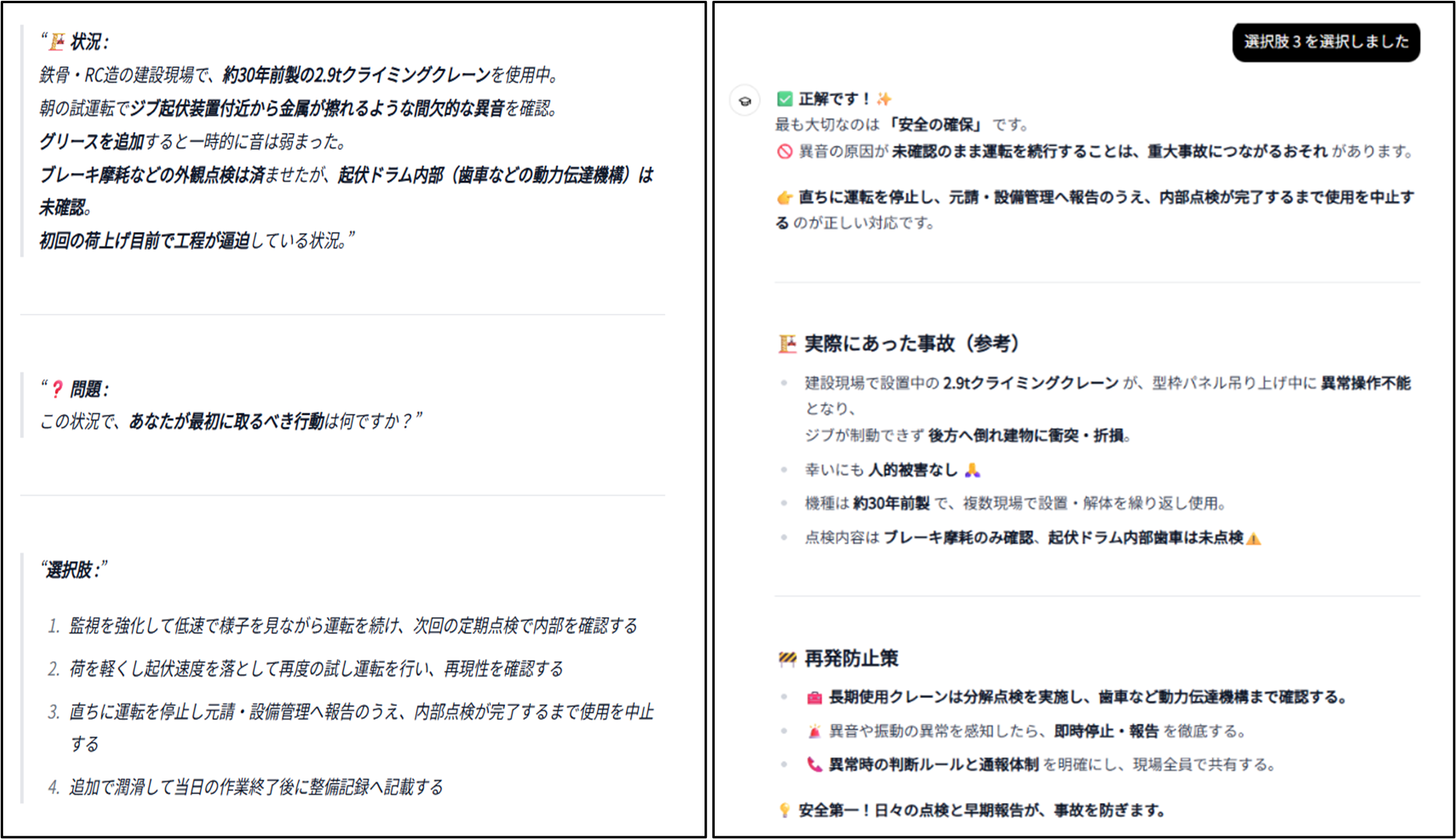 1.事故報告書から自社独自のケーススタディを作成 実際に発生した事故報告書などの文書をAIが読み取り、詳細なケーススタディを生成します。フォーマットの統一は不要です。 2.お客様が自社でケーススタディを拡充可能 各社で事故報告書からケーススタディを随時追加できるため、実態に即したケーススタディ教育の内製化が可能です。また、読み取った情報は導入企業内で管理するため、安心してご利用いただけます。 3.最新テクノロジーにもエンジニアが定期対応 生成AIの進化に対応し、「AI-OJT」のエンジンは当社のAIエンジニアが定期的にアップデートを実施いたします。 4.生成AI担当者の教育も実施 サービスの導入だけでなく、自社で運用を行うために必要な知識を学ぶ生成AI研修もご用意。各社の要望に合わせた内製化のご支援・伴走を行います。 5.自社LMS「Leaf(リーフ)」(※1)と連動し人事評価や教育管理に活用可能 アクティブユーザー数500万人(※2)を超えるサービスLMS「Leaf(リーフ)」と本プロダクトが連動し、人事評価や教育管理にもご活用いただけます。 |