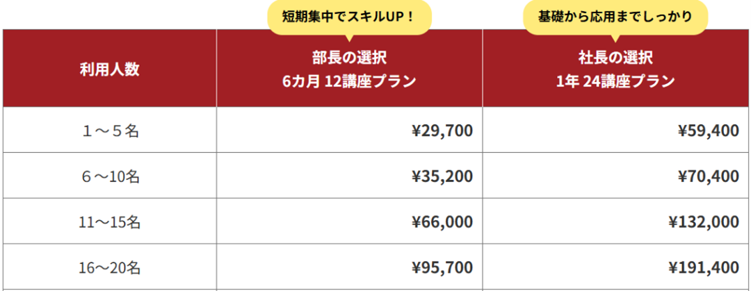 <定期便> ・価格例(税込) ![]() ※配信する人数と配信期間・講座数によって異なります ※20名以上のご利用も可能です ※動画の配信期間は6ヵ月または1年単位となりますが、継続してご契約いただけます <定期便~セミオーダー>定期便のコース内容をカスタマイズ ・価格:上記「定期便」の料金に加えカスタマイズ費用(初期費用)5,500円(税込) ※動画の配信期間は1年単位となりますが、継続してご契約いただけます ※20名以上のご利用も可能です ※配信する動画の本数に関しては24講座以上の設定も可能です |