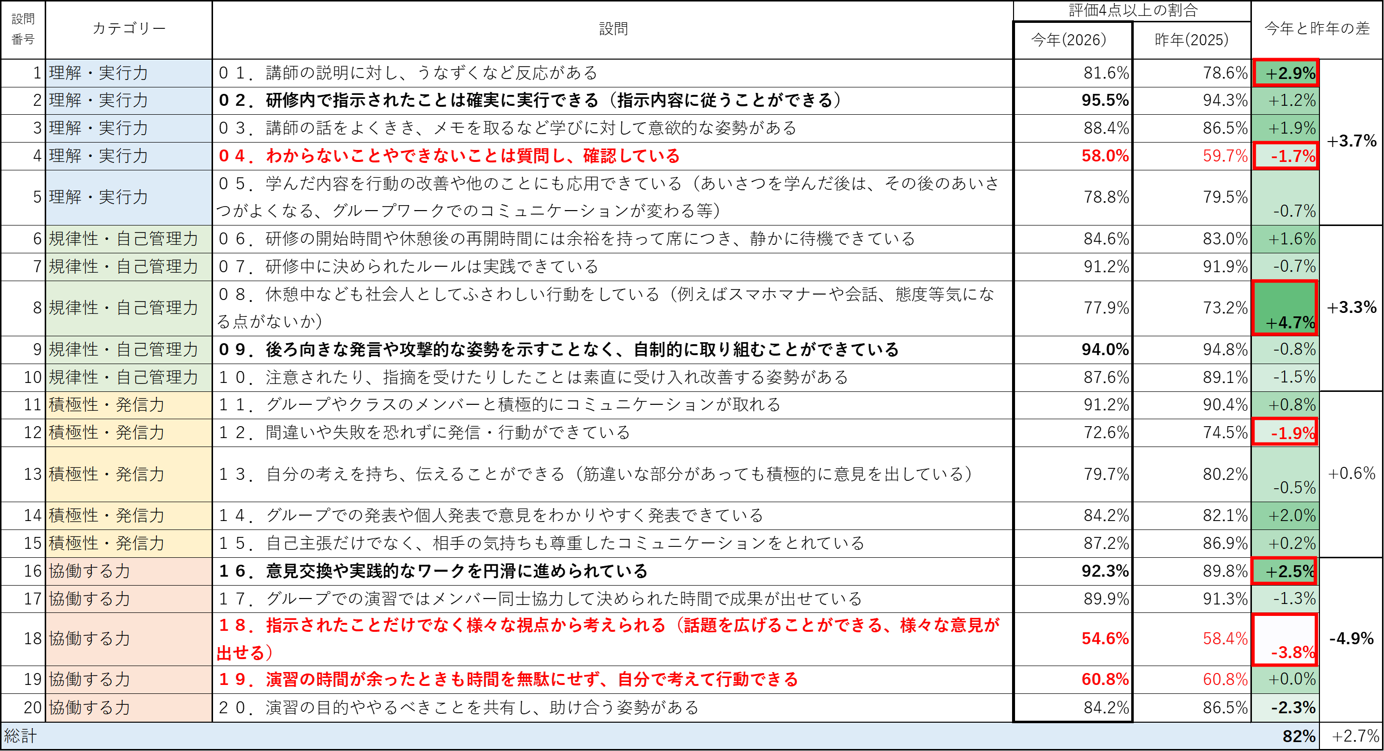 「指示されたことは確実に実行できる」は4点以上で95.5%と大半を占め、講師からのコメントでもよい点として最も多くあがりました。近年同様の傾向ですが、より傾向が強くあらわれるようになっています。また、「説明に対するうなずきがある」のポイントも上昇しました。講師からのコメントでも「今年はこの数年とレスポンスが異なり、疑問があれば前向きに質問してくる」と、コロナ禍の影響とみられていた反応の薄さやコミュニケーションの消極性は和らいだ傾向にあります。