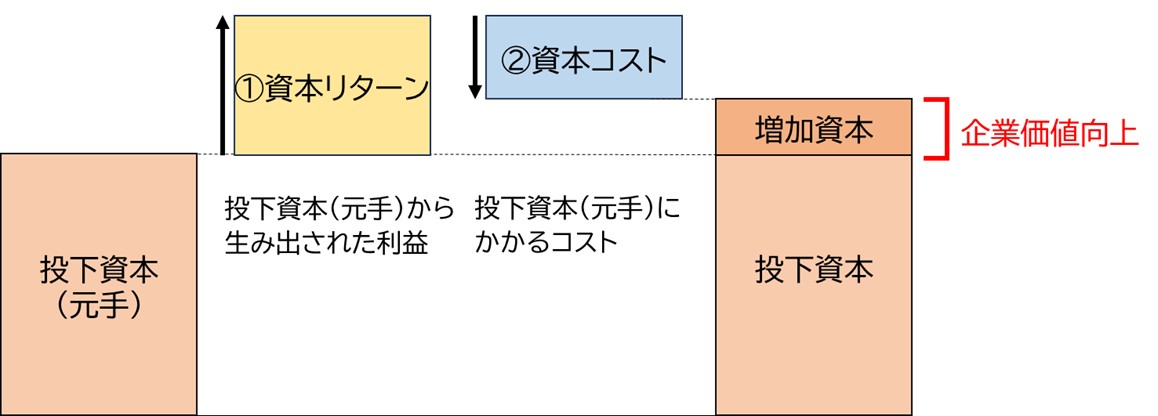 会社は銀行や株主から資本を調達し、運用することでビジネス活動を行い、資本リターンを源泉として利息や配当を支払います。これらは資金調達のために必要なコスト、つまり「資本コスト」です。資本コストを上回る資本リターンを稼ぐことで、会社の資本を増やし、企業価値を高めることができます。
