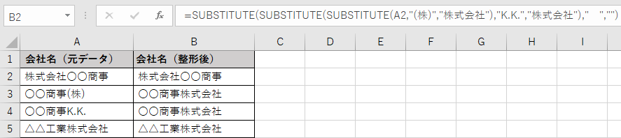 この数式では、まず(株)を株式会社に、次にK.K.を株式会社に置き換えています。さらに、全角スペースが混入している場合も想定し、" "(全角スペース)を""(何もなし)に置き換える処理も加えています。このように、SUBSTITUTE関数を複数組み合わせることで、複雑な置き換えも可能です。