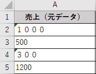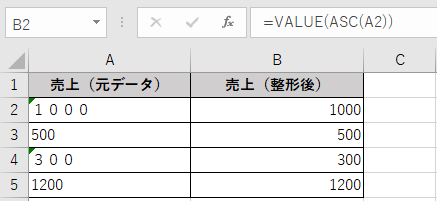 売上データに、全角数字で入力されたもの(1000など)と半角数字(500など)で入力されたものが混在しているとします。