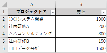 - 「プロジェクト名」列のフィルターボタンをクリックし、「社内研修A」と「社内研修B」のチェックを外します。
