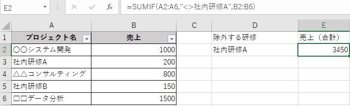 数式: =SUMIF(A2:A6,"<>社内研修A",B2:B6)