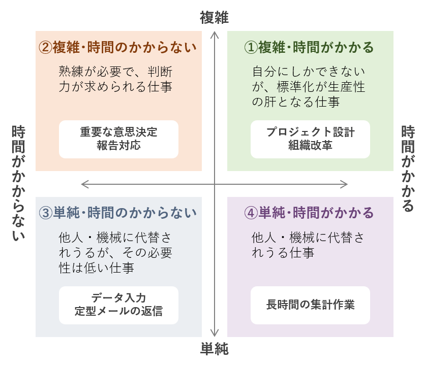 まず、「AIに代替される可能性が低い仕事」とはどのようなものでしょうか。「複雑さ」と「所要時間」の2軸から、業務の特性を以下の4つに分類してみましょう。