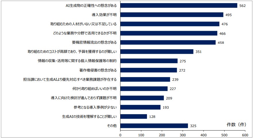 令和6年度に総務省から発表されたデータによると、自治体ではAI活用に「リスク管理の難しさ」について以下のような3項目の懸念があることが明らかになりました。