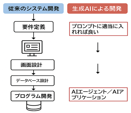 また、既存のシステム開発が不要になるかと言えば、2025年現時点では、大量の定型業務を処理するなら、やはり従来からのシステムの方が安心であり、効率的です。生成AIは大量処理をハイスピード実施するのは向いていませんし、運用コストは従来からのシステムの方が極めて廉価です。また、大量処理システムに求められる安定性や安全性も、まだまだです。