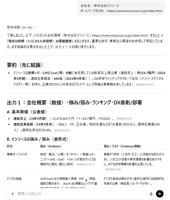 インソースは上場企業なので、社長である私は、会計基準について時々考えます。現在の日本基準をIFRSに変えたら、経営数字がどう変化するのか知りたいと思いました。ただ、計算が面倒で、概算でも、すぐには自分では出せません。試しに生成AIに当社の有価証券報告書を読ませると、僅か1分50秒で計算してくれました。このスピードと手軽さは驚きでした。