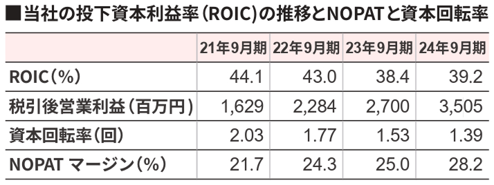 資本回転率は低下傾向にあり、売上利益率が向上しているにもかかわらずROICが低下傾向にある原因になっています。株主還元を昨年度(24/9期)、「配当性向40%を目途に、業績に連動した配当を実施」から「配当性向50%、株主資本配当率(DOE)18%を目標とする配当を実施」に変更しました。この変更はバランスシートの改善を通じた資本回転率向上に資するものと考えています。