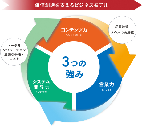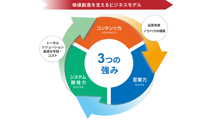 当社の価値創造を支えるビジネスモデルにおける3つの強みは①営業力、②コンテンツ力、③システム開発力にあります。システム開発力を増強することで、コンテンツ力、営業力も向上し、当社の成長に直結すると考えています。