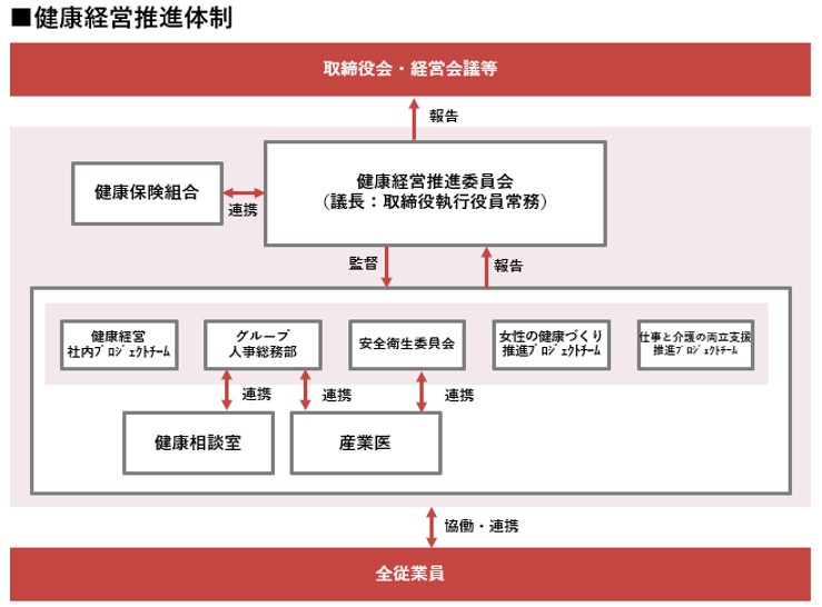 全社における健康推進の担当役員は取締執行役員常務です。また、グループ人事総務部に属する健康推進担当が中心となり、産業医や安全衛生委員会、各事業所の健康経営推進担当者等と連携して体制を整備しながら、施策の実行・効果検証を行っております。