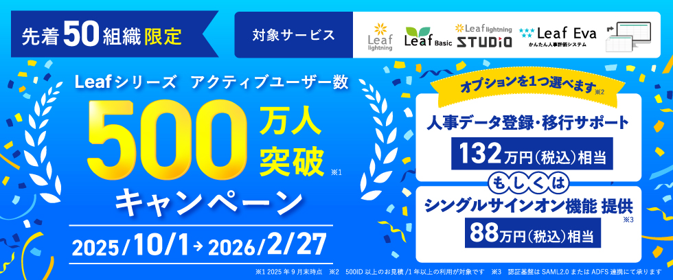 また、この度Leafはアクティブユーザー数500万人を超えることができました。皆さまの変わらぬご愛顧に感謝を表わすと共に、昨今のeラーニング需要増にお応えして、500万人記念キャンペーンを実施いたします。お得にLMSを導入できる機会となりますので、ぜひ一度ご検討ください。