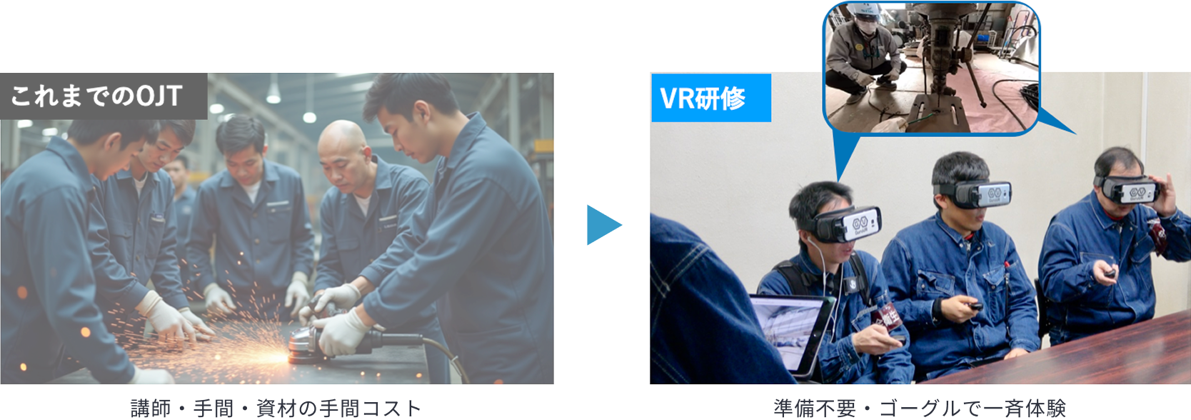 これまで講師や現場、資材が必要だったOJTでの各種教育も、現場を360度で再現。