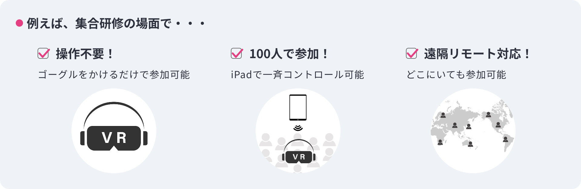 初めてVRをご体験される方でも、ゴーグルだけで操作できるシンプルな設計にしており、誰でも簡単に運用できます。