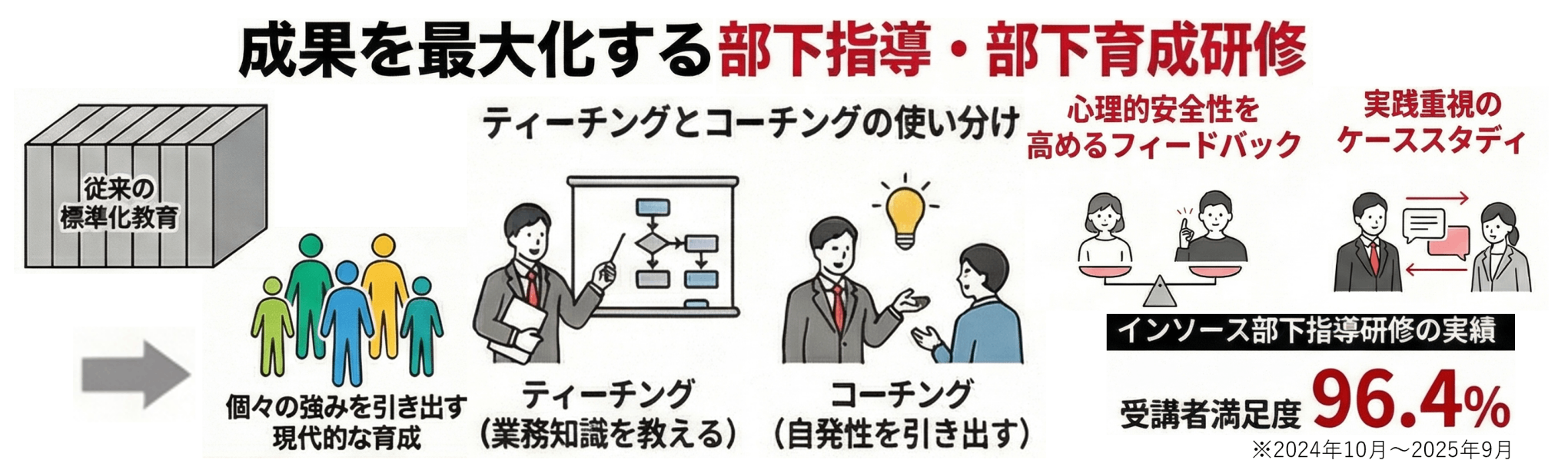 インソースでは部下を早期に独り立ちさせるコーチングの手法や、部署全体で対象者の成長をフォローするOJT指導の体制構築について学ぶ基本のプログラムのほか、一人ひとりに合ったアプローチ法を考える行動経済学(ナッジ理論)や1対1面談を活用したコンテンツも開発しています。いずれも単に効果的な指導のポイントを紹介するだけでなく、ケーススタディやロールプレイングを繰り返すことで定着を図ります。