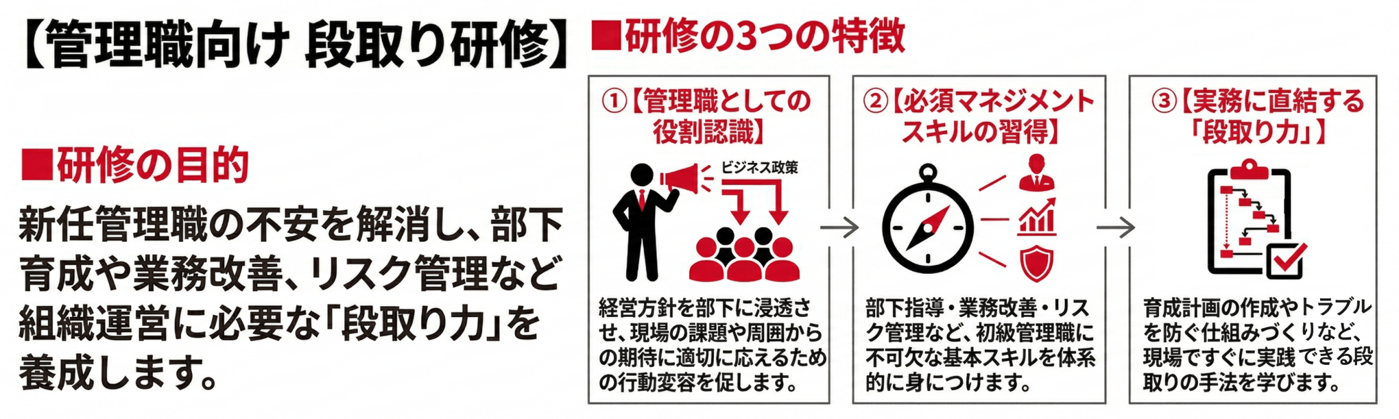 これらの初級管理職に必須のマネジメントスキルの習得をご支援いたします。