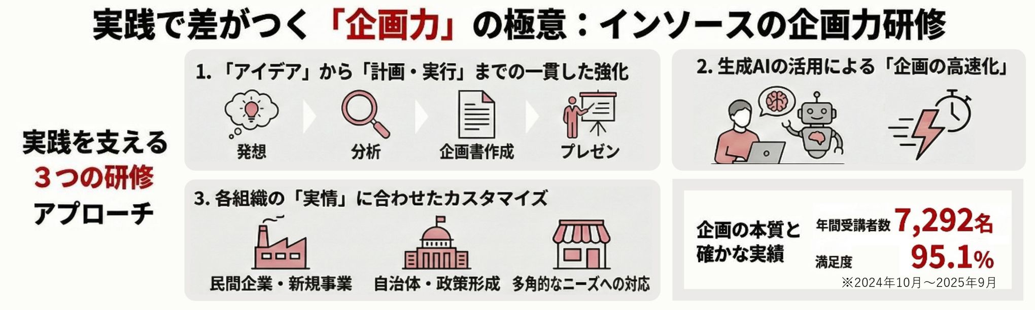 企画力を高めたい、と一口に言っても、企画力は様々な要素で構成されています。インソースの企画力研修は「アイデア~企画~計画」の一連の流れを視野に入れて、その全体像を理解するだけでなく、発想・企画・実行などそれぞれのプロセスごとの強化を行うために多くのプログラムを開発しています。