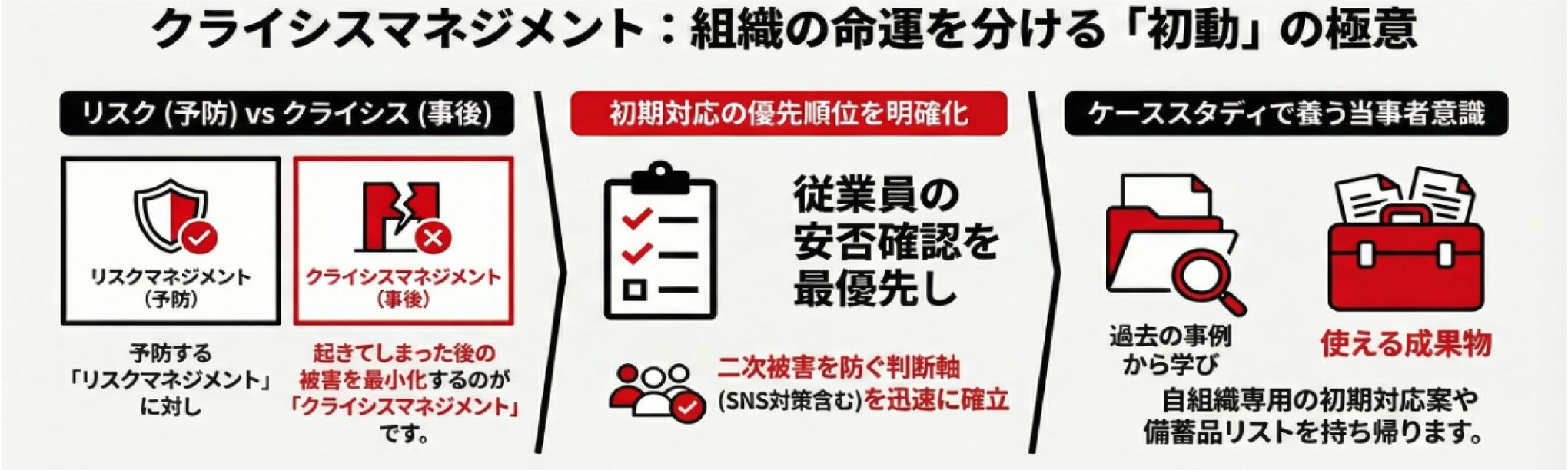 本研修は危機に迅速に判断、行動できる自信がないという不安や課題を解消する研修です。危機は起こる前にどれだけ想定できるかが、重要な要素となります。事例やケーススタディを多く用いて、実際の場面を想定することで、現実に起こった際にも対応できるマインド、スキルを身につけていきます。