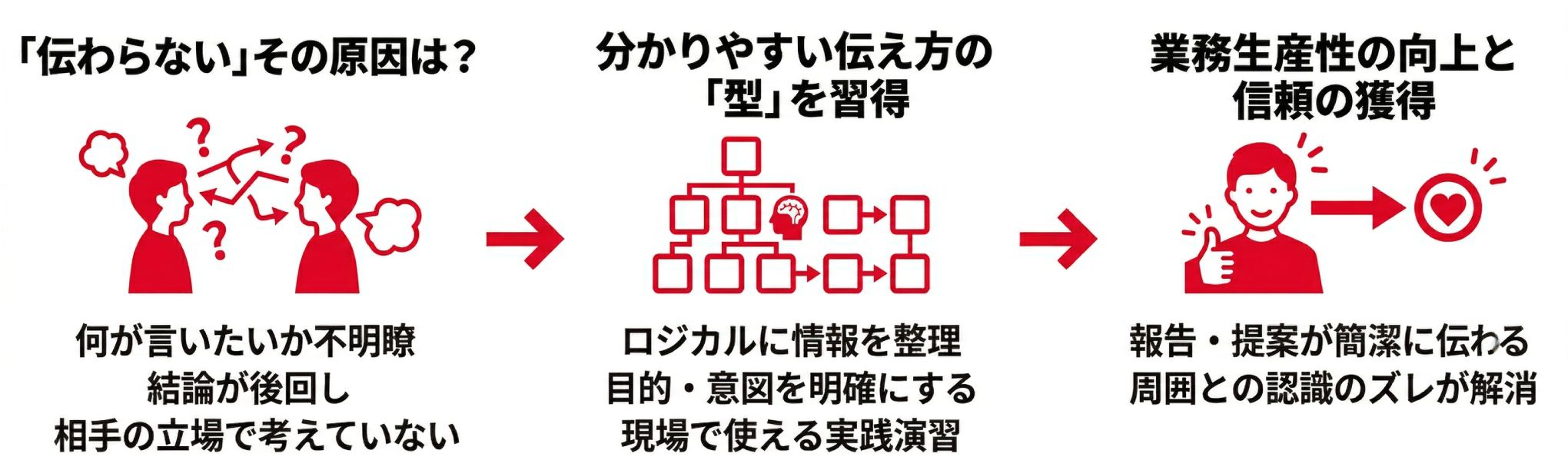 分かりやすい話の構造を理解し、論理的思考を鍛えることで、誰でも「言いたいことを簡潔に、相手に分かりやすく説明する」ことができます。話の基本的な展開を身につけ、ワークや演習を通じて、説明力を強化していきます。
