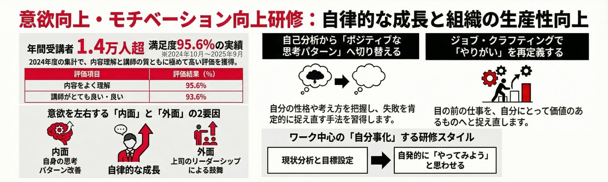 「研修を受けるだけで、モチベーションが本当に上がるのか?」という疑問を抱えている方は少なくありません。確かにモチベーションは、講師の話を一方的にただ聞くだけでは上がりません。 働く意欲というのは、組織のあり方や上司・先輩など、「自分の外」にある要因に影響を受けやすいものだからです。