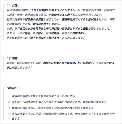知識定着度を測るテストだけでなく、実際の業務シナリオに基づいた「判断を問う設問」も生成可能です。