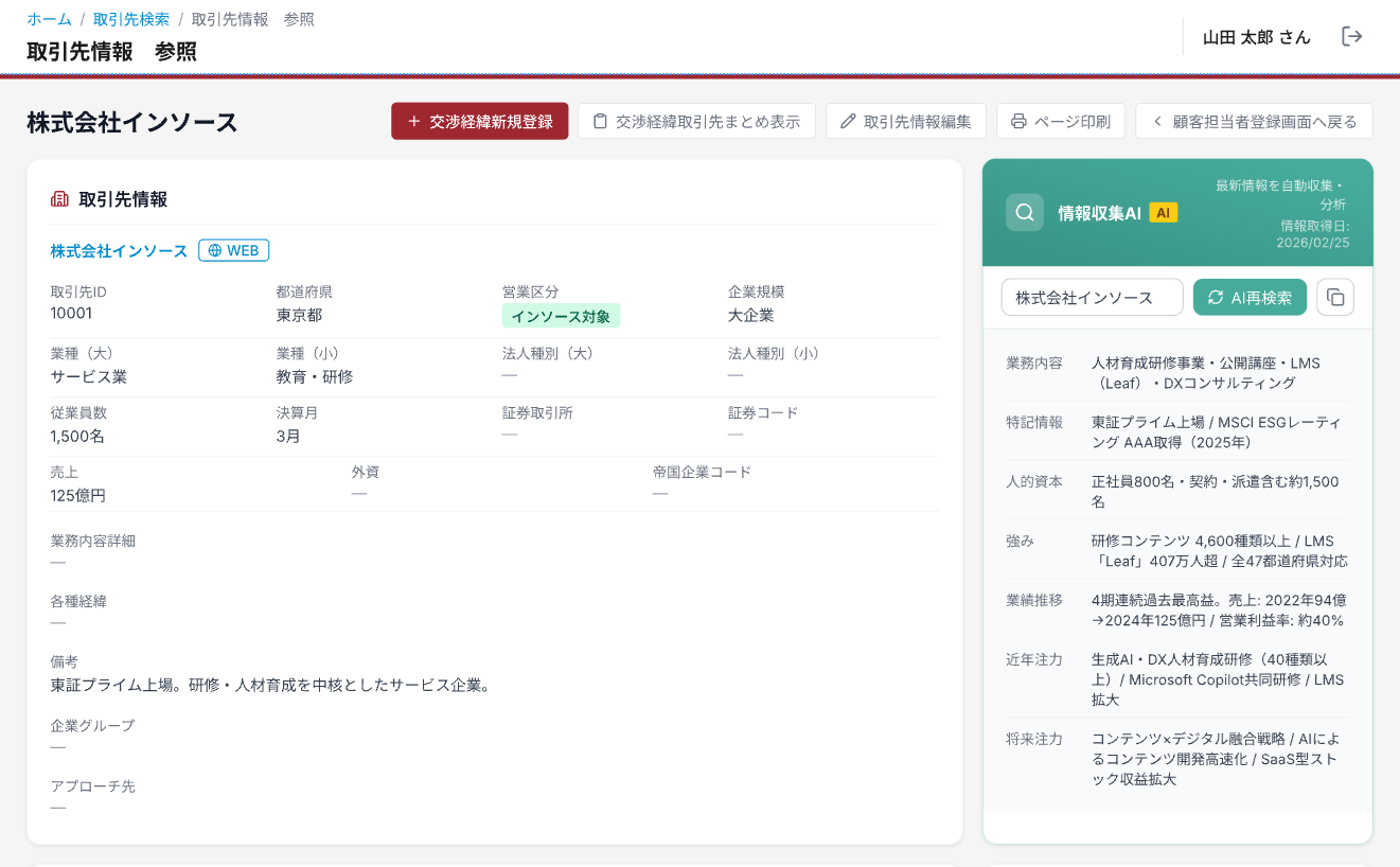 取引先企業情報の自動収集を皮切りに、営業活動を支援するAI機能を順次追加していきます。交渉履歴の自動要約や次回アクション提案など、現場の声を反映しながら進化を続ける営業支援ツールです。