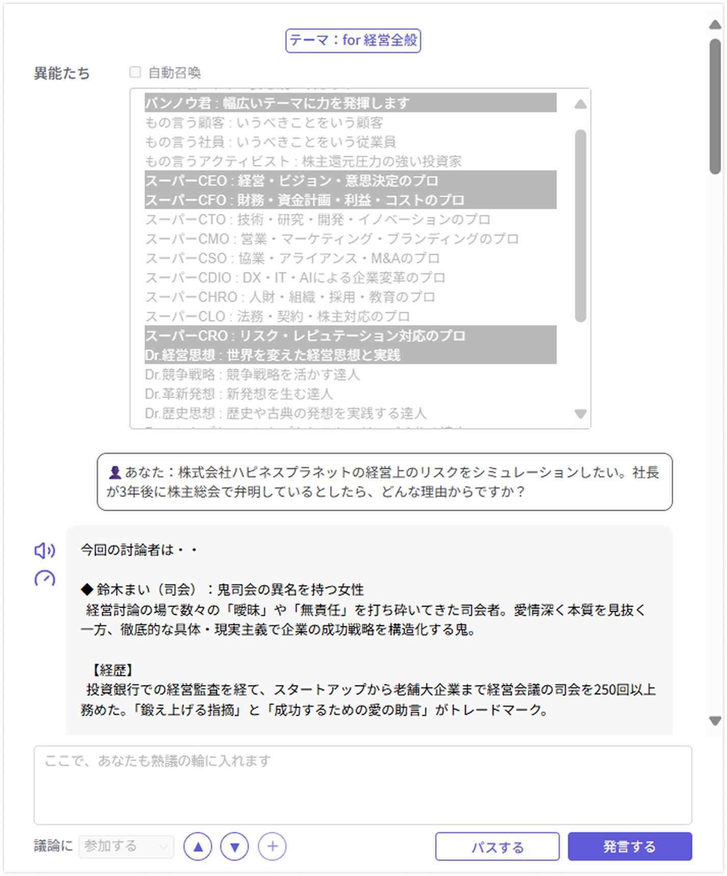 そこには、CEOやCFOといった経営者の分身から、哲学者・歴史思想家・スポーツメダリスト・実業家など、専門的かつ多彩な思考モデルが人格として実装されています。