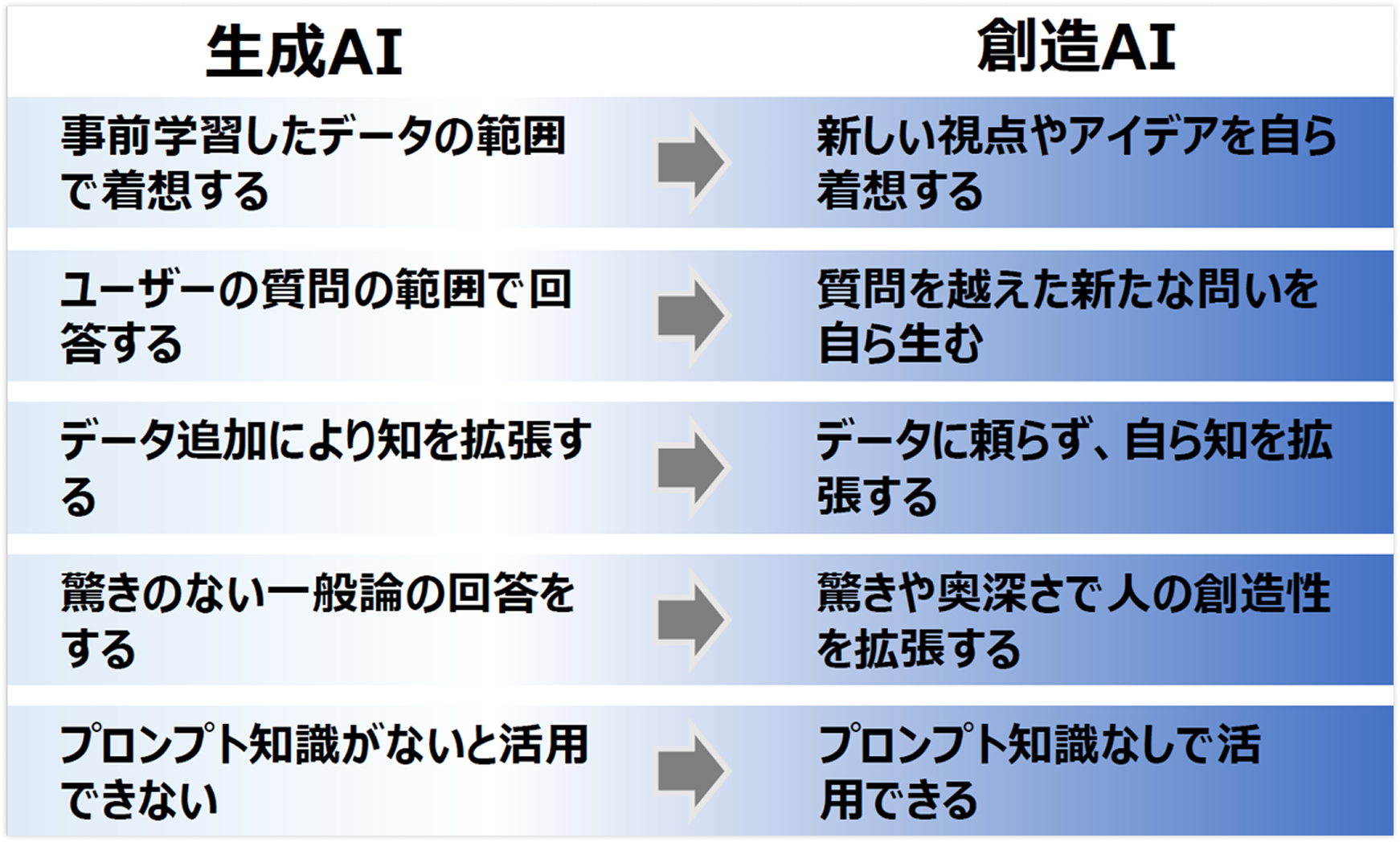 既存の生成AIが、答えがある問題に対して、事前学習したデータに基づいて回答を導き出すことに対して、FIRAは答えがない問題に対して、指示がなくても自律的に、自分たちで考え議論しながら新しい答えを探しに行く「創造AI」なのです。
