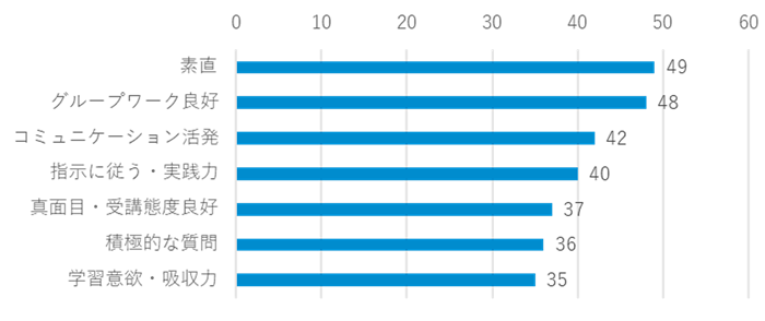 また、「説明に対するうなずきがある」のポイントも上昇しました。講師からのコメントでも「今年はこの数年とレスポンスが異なり、疑問があれば前向きに質問してくる」と、コロナ禍の影響とみられていた反応の薄さやコミュニケーションの消極性は和らいだ傾向にあります。