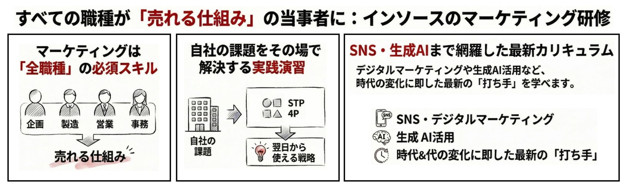 モノが売れなくなったといわれて久しい現在、少子化や不況、大規模な市場変化、ITツールの普及によって、マーケティングの重要性も大きく変わってきています。「商品が良い」だけではなく、顧客のニーズを理解し、需要に合った商品の提供を行わなければ、組織として成長が見込めなくなってきました。そのため、従業員一人一人が購買プロセスを理解し、継続的に商品・サービスを購入してもらうための仕組みを発想する力を得ることが重要です。