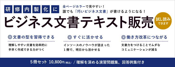 社会人に欠かせない「書く」スキルを1日で身につけられる内容となっているため、ビジネス文書研修を組織内で企画・実施したいとお考えの組織の皆さまには、最適なテキストです。弊社の公開講座ビジネス文書研修でお伝えしているノウハウを、惜しみなく詰め込んでいます。