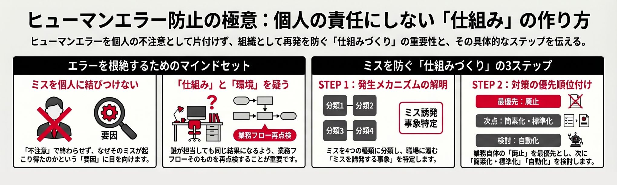 個人にミス防止を求めるのではなく、そもそもミスが起きない仕組み・環境を作る